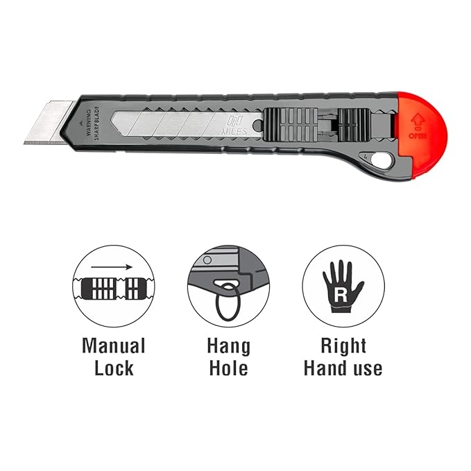 Plastic body with metal channel. Ergonomic handle with built-in blade snapper. With hang hole. 8-Segment Snap-off blade. Used for Paper, Cardboard, Vinyl, Glass Film, Plastic sheet, Wallpaper, Carpet, Rubber, Leather & Rexine, Packing & Corrugated material etc.